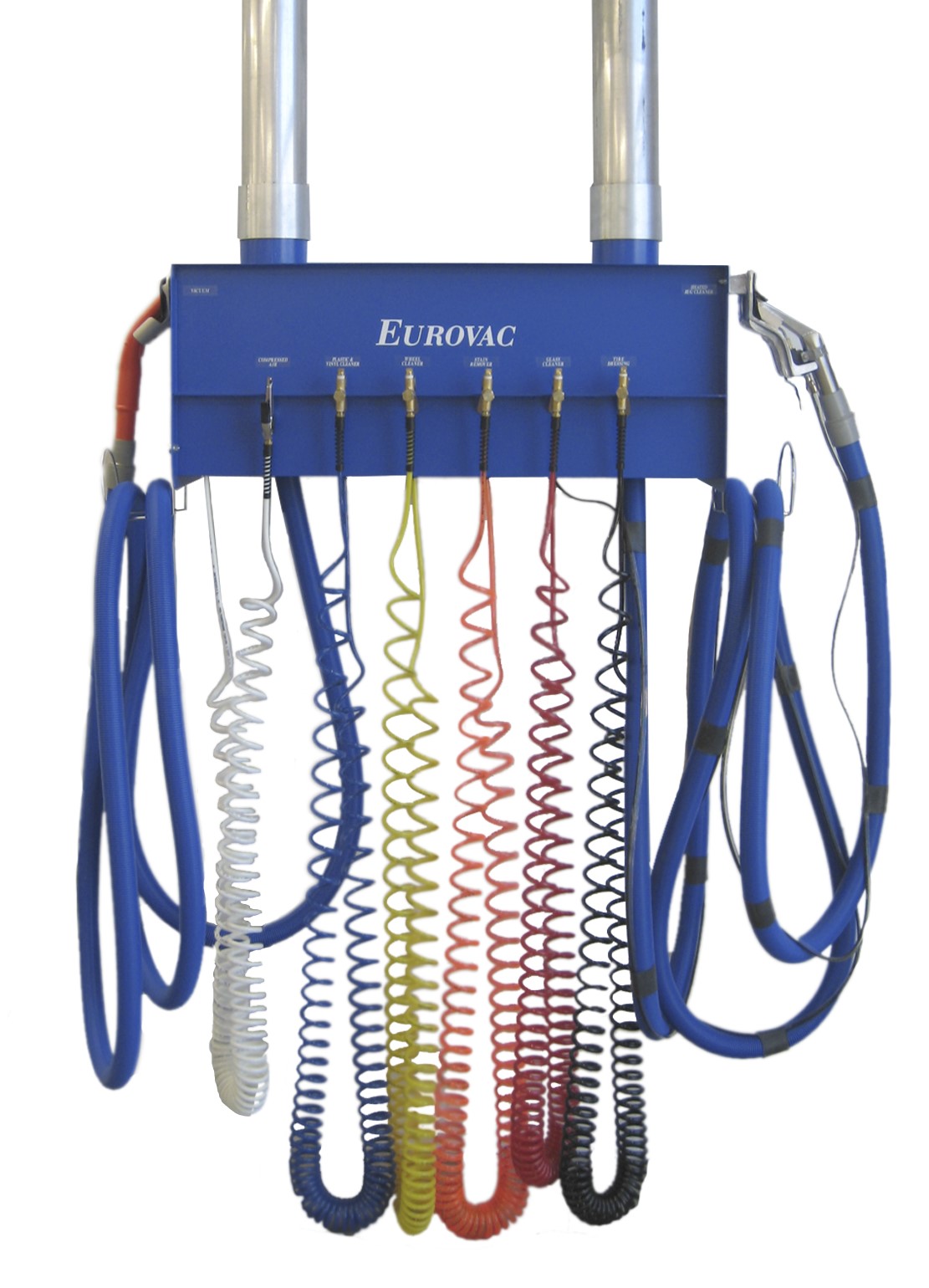 - 25’ Coiled Line & Air Blow Gun for blowing out particulate from hard to reach areas inside a car. Eurovac supplies a 15’ airline for running from the pendant drop up to the beams. Typically customer connects from this 15’ airline to the central air hard piping which is connected to a centrally located compressor system.